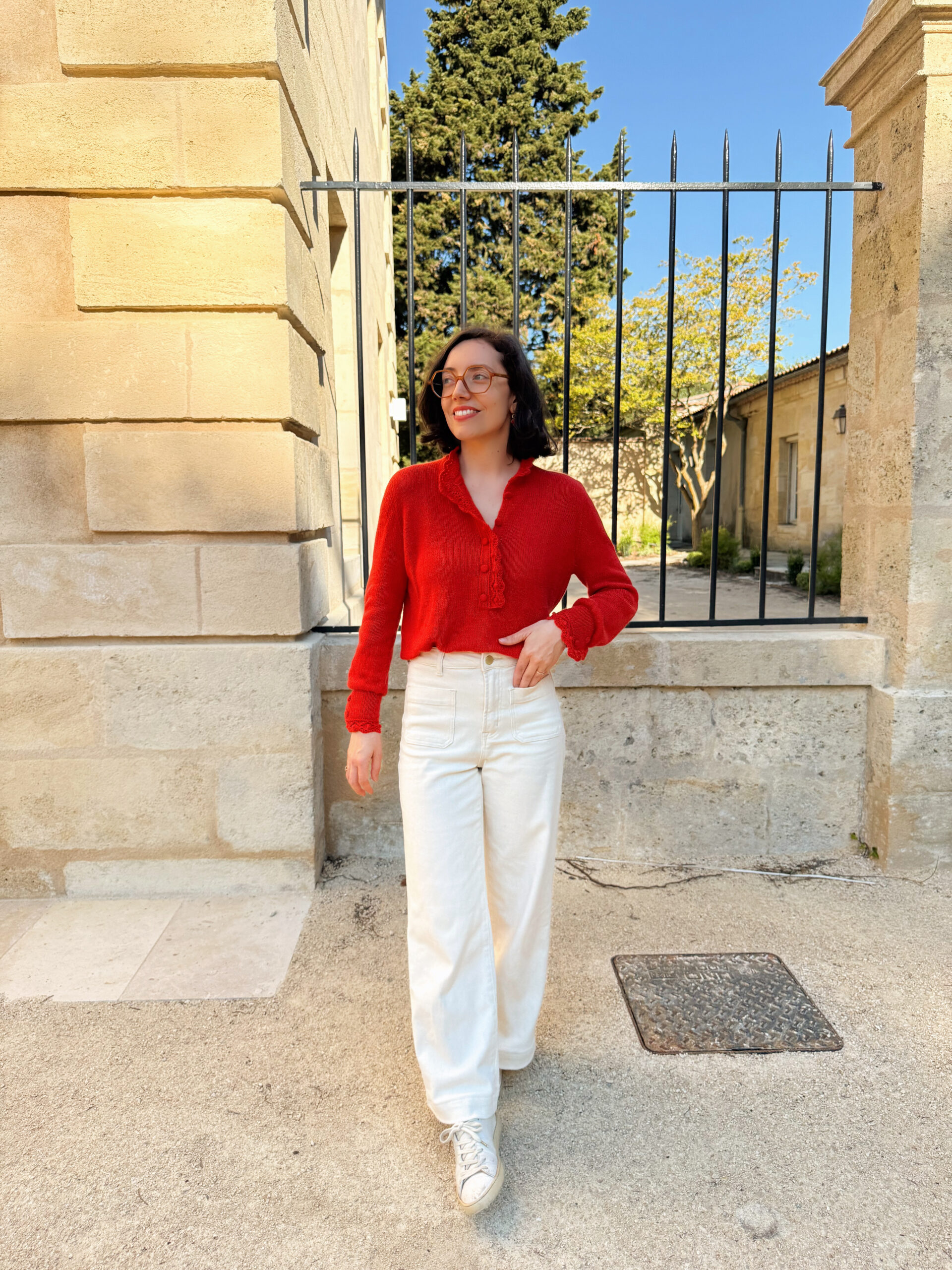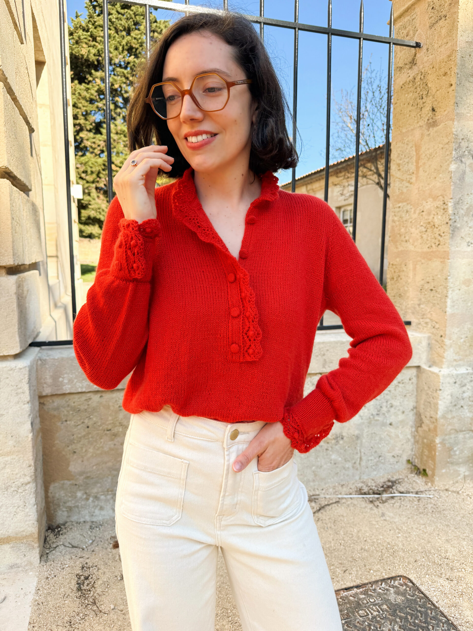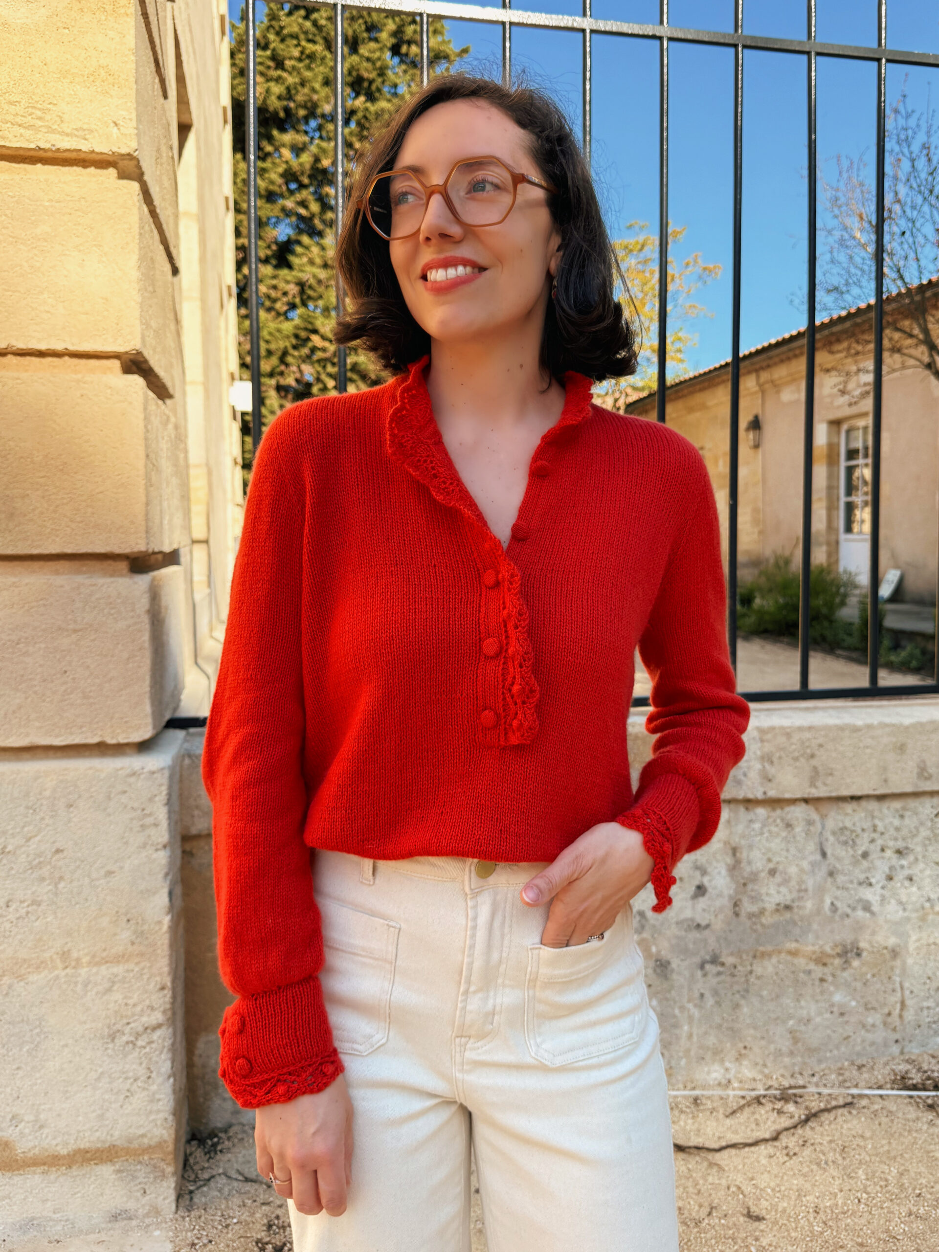 En photo : Taille S, portée avec 10 cm d’aisance positive, tricotée en Cashmere Classic de Cardiff, coloris 517 – Hermès.