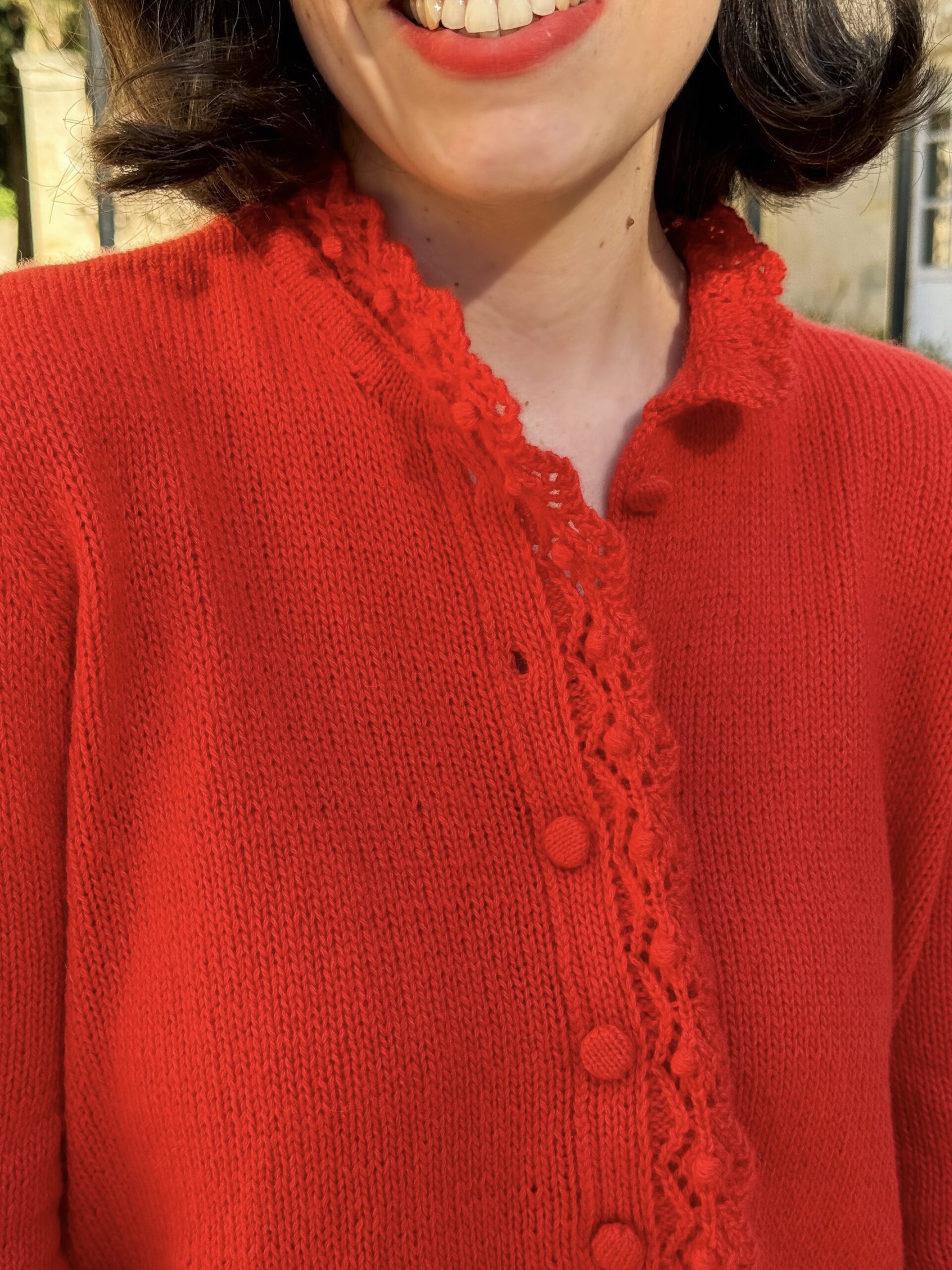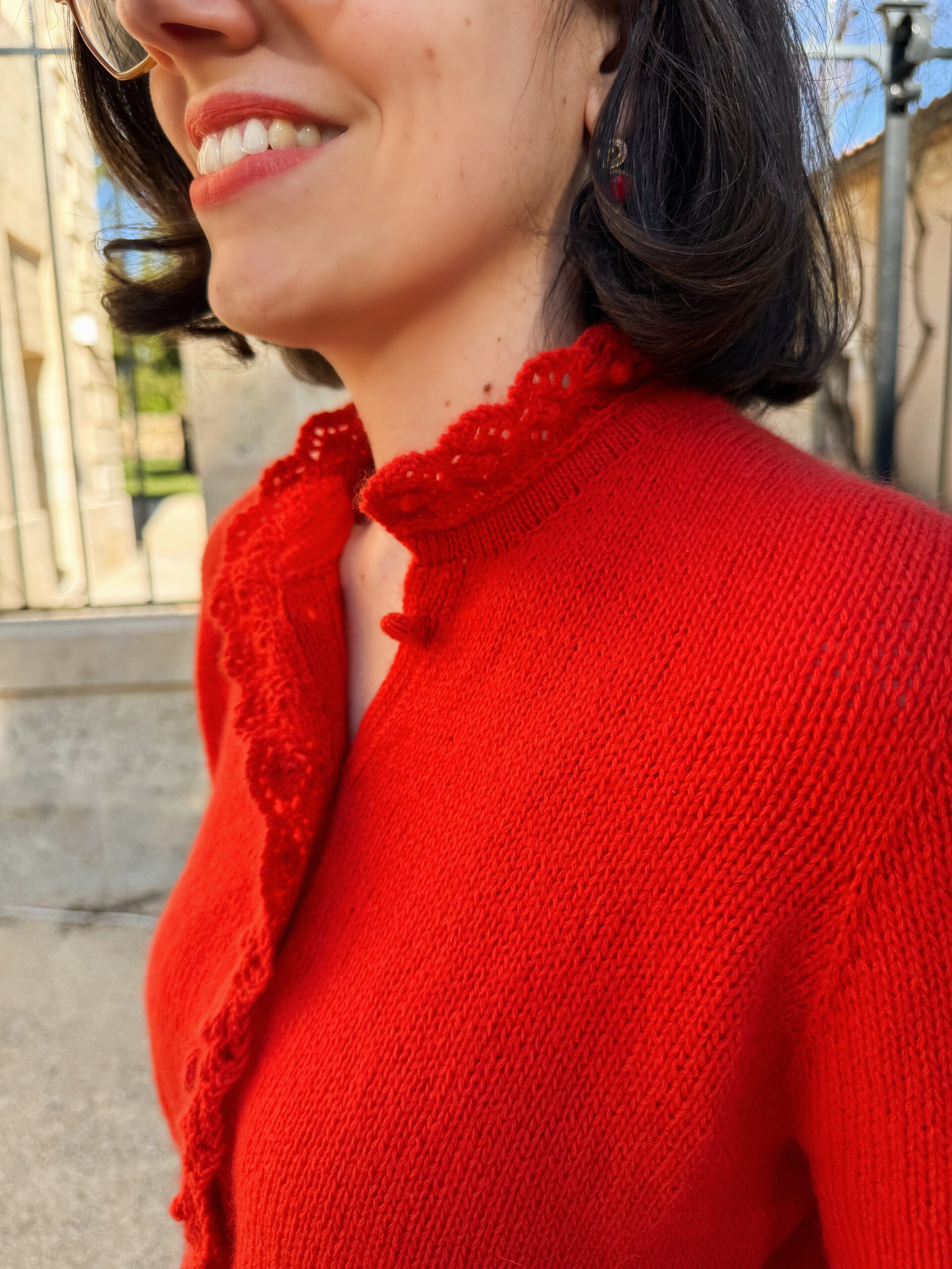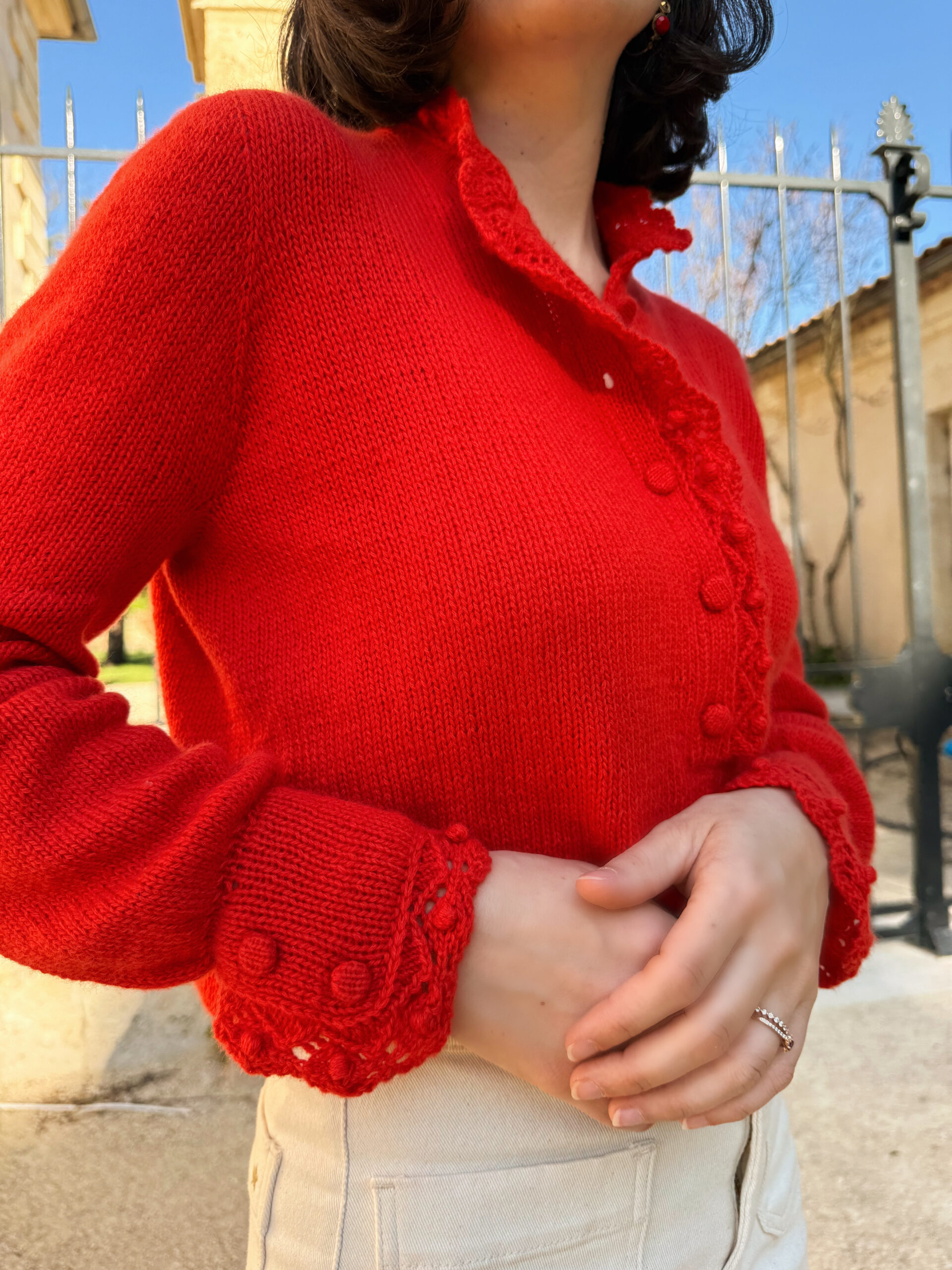 Difficulté : 4/5 (point dentelle, lecture de diagramme, construction des manchettes et du col, rangs raccourcis à l’allemande)