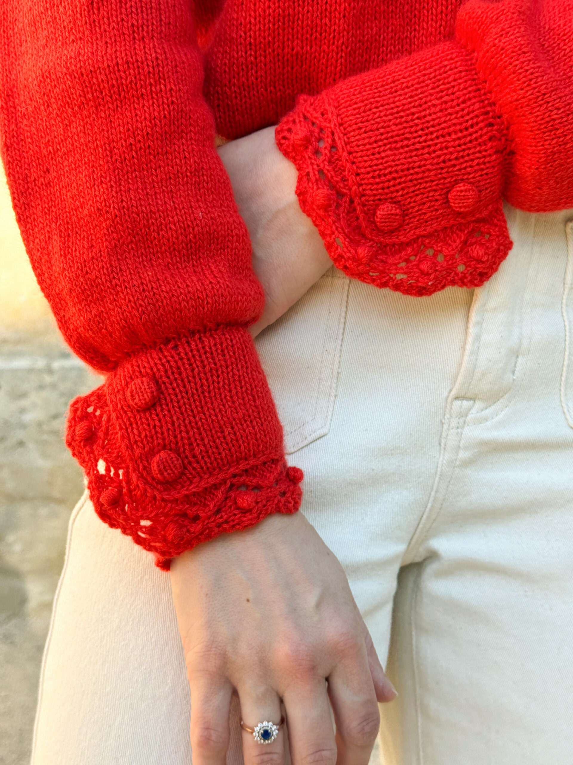 Le Poppy Bloom Sweater est un pull inspiré du style chemise, doté d’une patte de boutonnage et de manchettes ajustées aux poignets, ornées d’un élégant volant festonné. Le volant, comme le reste du pull, est entièrement tricoté. Les manchettes, serrées aux poignets, se ferment à l’aide de boutons-pression, et des boutons décoratifs sont cousus par la suite. Ce modèle est conçu pour faciliter l’allaitement grâce à sa patte de boutonnage. Il se tricote en circulaire, en une seule pièce et de haut en bas, avec un fil de type DK.